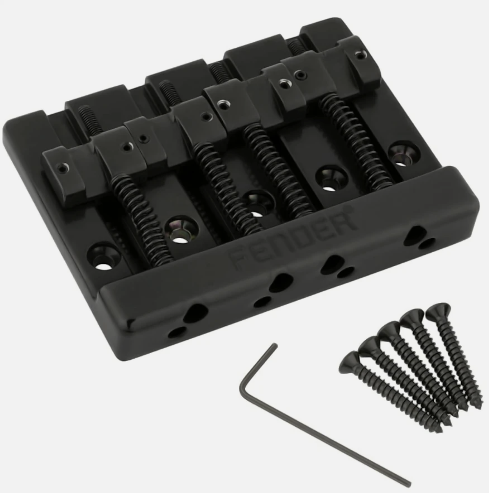 Genuine Fender Black High Mass 4-string Precision Bass / Jazz Bass bridge with zinc saddles. Drop-in replacement for vintage style bass bridges with 5 mounting screws. Includes mounting screws and hex wrench for saddle adjustment.